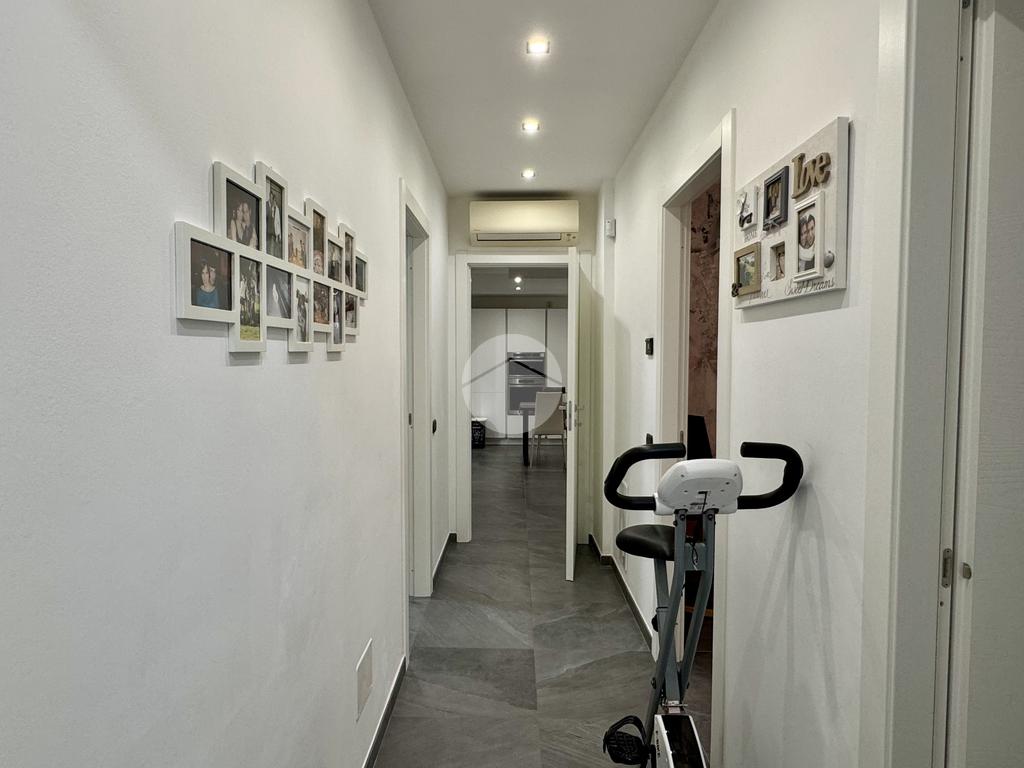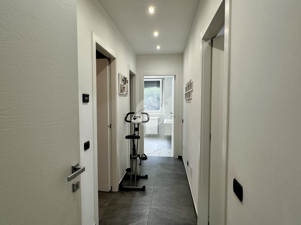 Il corridoio distribuisce gli ambienti in modo funzionale, portando ai due bagni, uno con doccia e l'altro con vasca, entrambi progettati per garantire comfort e luminosità.